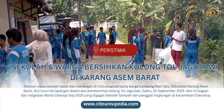 Citeureup, Jawa Barat — Ratusan siswa sekolah dasar dan menengah di Citeureup bersama warga Kampung Pasir Ipis, Kelurahan Karang Asem Barat, ikut turun ke lapangan dalam aksi pembersihan kolong Tol Jagorawi, Sabtu, 20 September 2025. Aksi ini bagian dari rangkaian World Cleanup Day 2025 yang digagas Sekolah Sampah dan penggiat lingkungan di Kecamatan Citeureup.